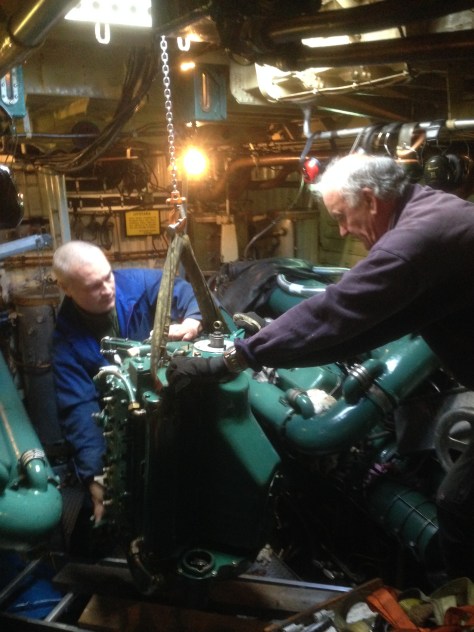 Med en del ingenjörsskap och glada (och möjligen enstaka mindre glada) tillrop kom den nya motorn ner genom luckan till maskinrummet.