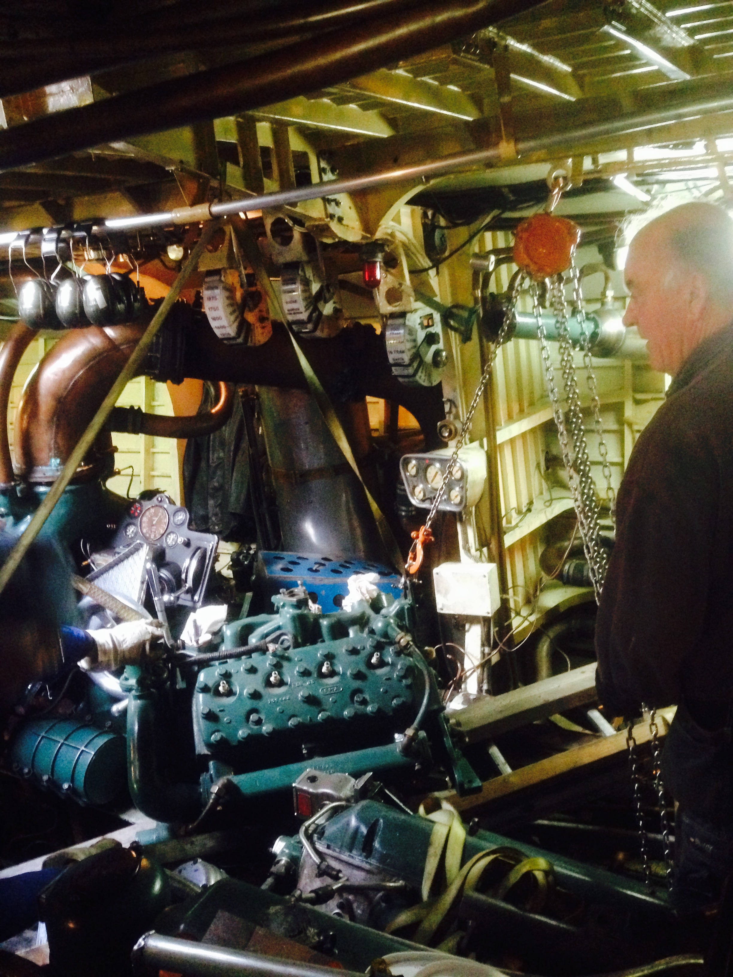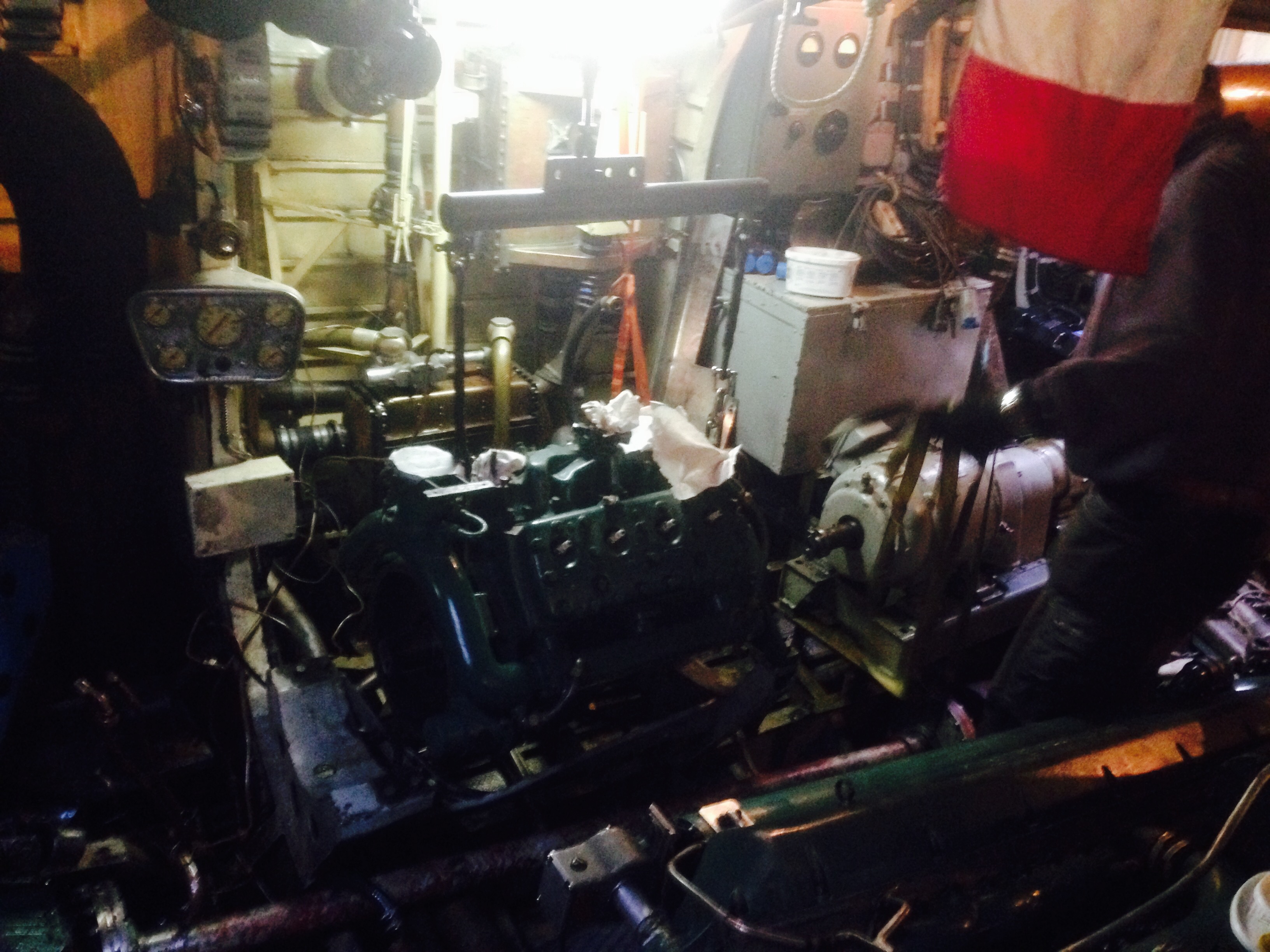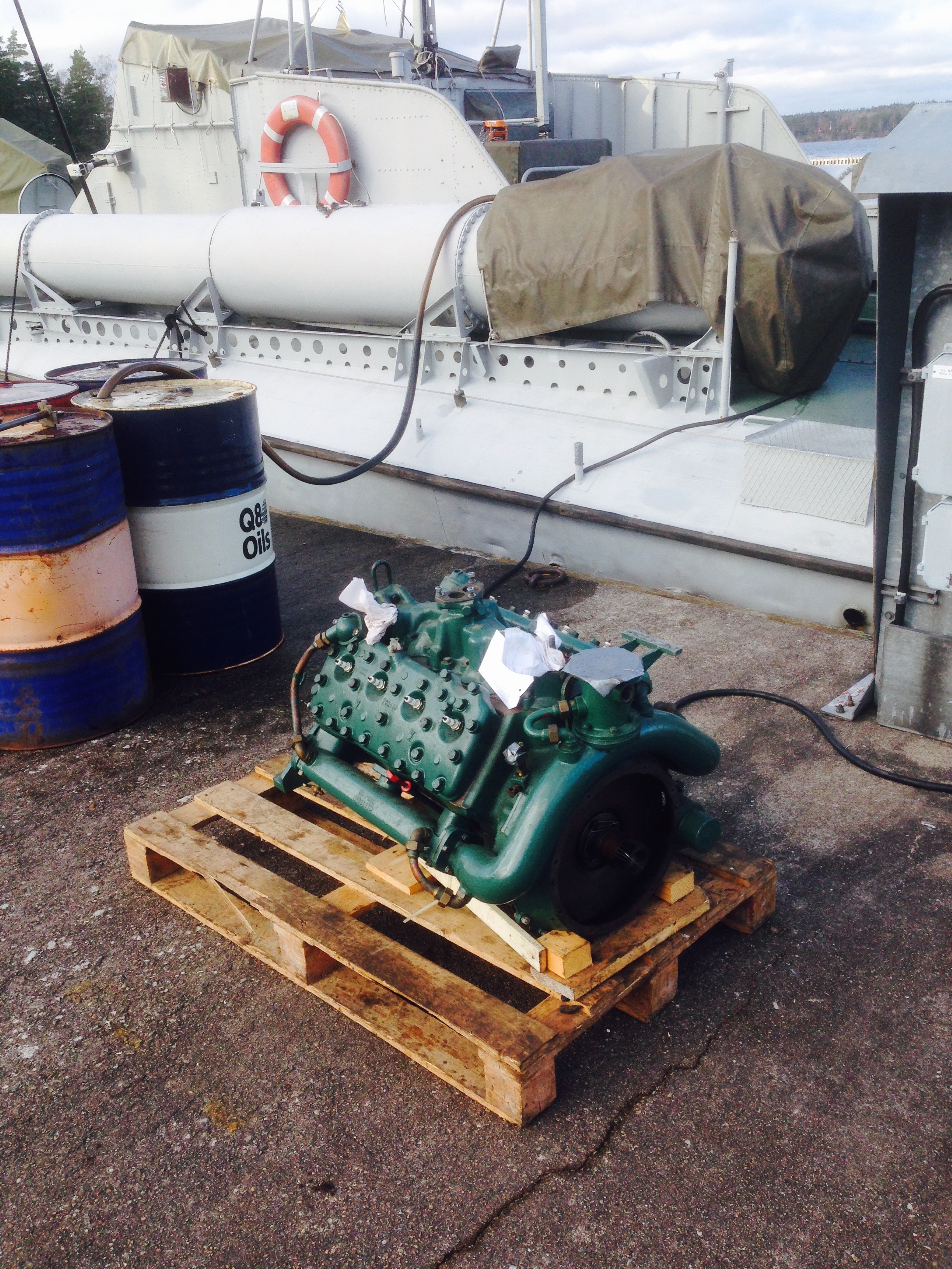 Väl nere i maskin var det så dags att få motorn på plats in i motorbädden. Inte helt trivialt, eftersom vi inte har någon travers i maskinrumstaket…
